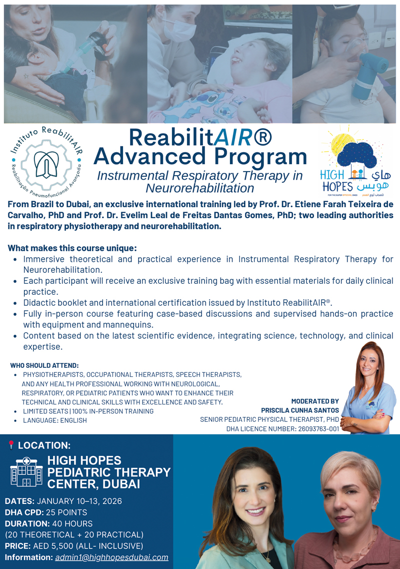 From Brazil to Dubai, an exclusive international training led by Prof. Dr. Etiene Farah Teixeira de Carvalho, PhD and Prof. Dr. Evelim Leal de Freitas Dantas Gomes, PhD; two leading authorities in respiratory physiotherapy and neurorehabilitation.